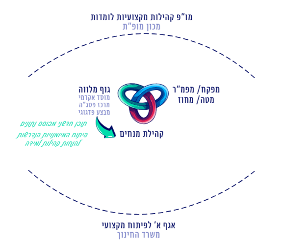 שותפים אלו חוברים למוסד מלווה (לרוב גוף אקדמי) המתמחה בתחום הייחודי של הקהילה (לדוגמה: את קהילות הביולוגיה מלווים מוסדות אשר חוקרים את תחום הוראת הביולוגיה) אשר אמון על הקמת וליווי קהילת המנחים. במסגרת פעילות קהילת המנחים, המוסד המלווה מספק להם תוכן חדשני מבוסס נתונים (מיומנויות, ידע תוכן ואסטרטגיות הוראה רלוונטיות) ומכשיר אותם בפיתוח המיומנויות הנדרשות להנחות קהילות למידה (איור 2).